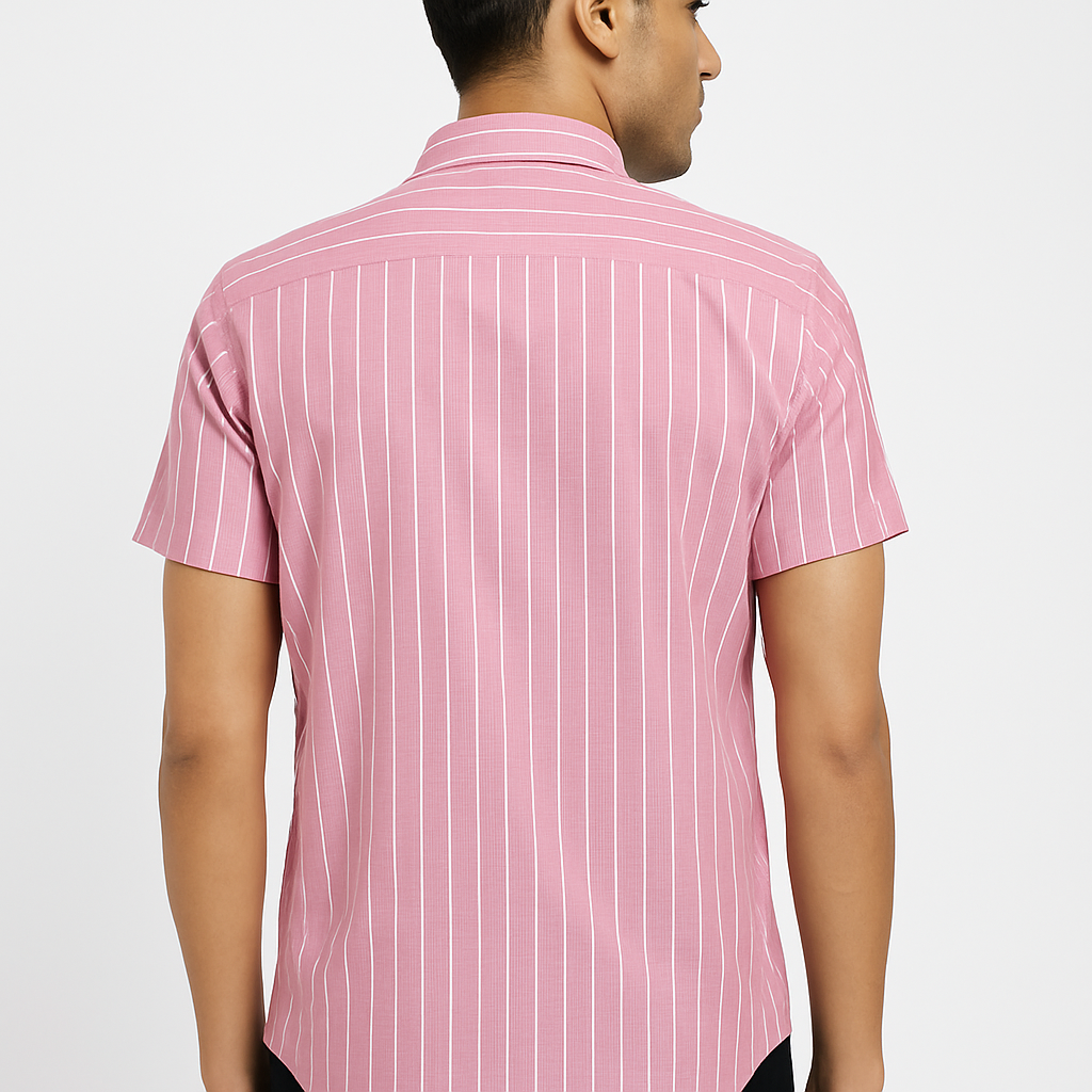 A stylish rose pink short sleeve shirt with white vertical stripes, perfect for smart-casual dressing.