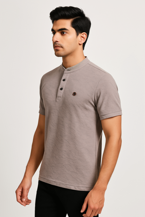 A refined taupe-colored t-shirt featuring a mandarin collar and triple-button placket, crafted from soft, textured fabric for a modern and elegant look.