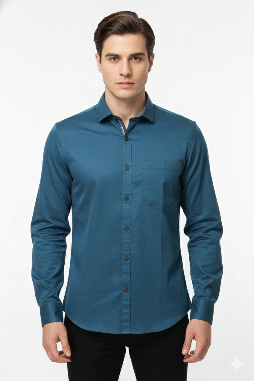 A sleek teal blue cotton shirt with a polished finish — perfect for workdays, evenings, or smart-casual occasions.