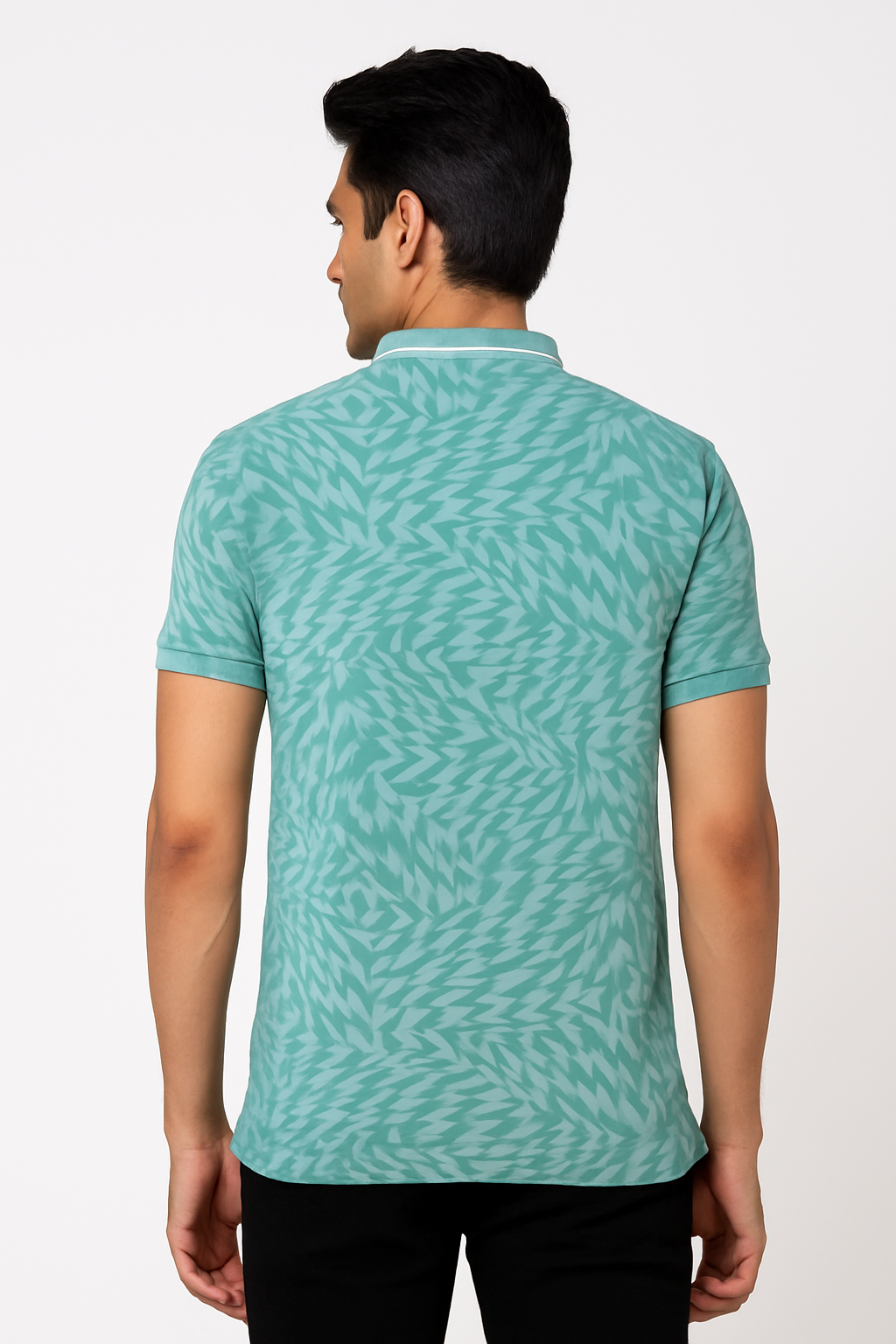 Men’s Teal Geometric Polo T‑Shirt – Contrast Tipped Collar, Regul