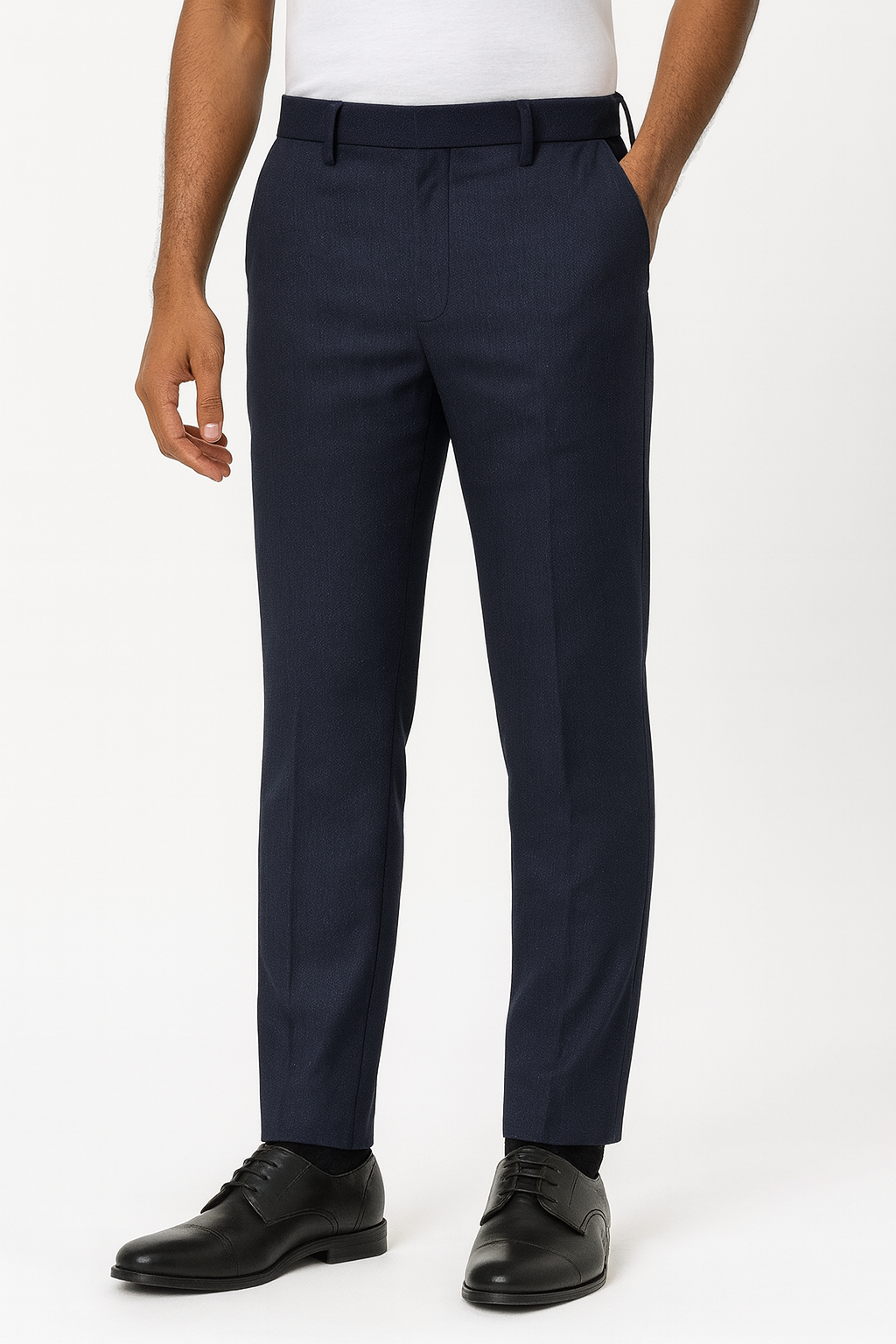 Navy blue textured slim-fit trousers with a refined tailored silhouette, flat-front construction, and crisp crease lines—ideal for office wear, business events, and smart formal styling.