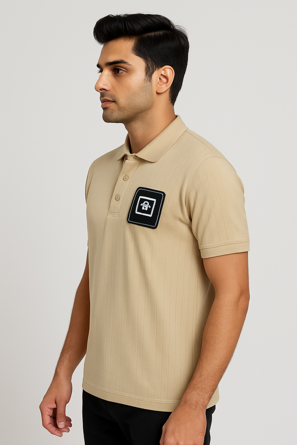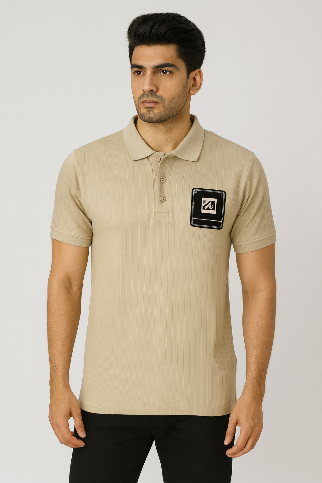 Add a modern edge to your basics with this Men’s Vertical Ribbed Polo Shirt. Crafted from a soft, breathable knit fabric, it features a distinctive all-over vertical rib texture that provides a refined look and a flattering fit. The classic polo silhouette is updated with a three-button placket and a versatile camel/beige color. The shirt’s standout feature is the large, contemporary graphic chest patch in black and white, offering a bold, street-style accent. This piece is perfect for making a statement while maintaining casual comfort.