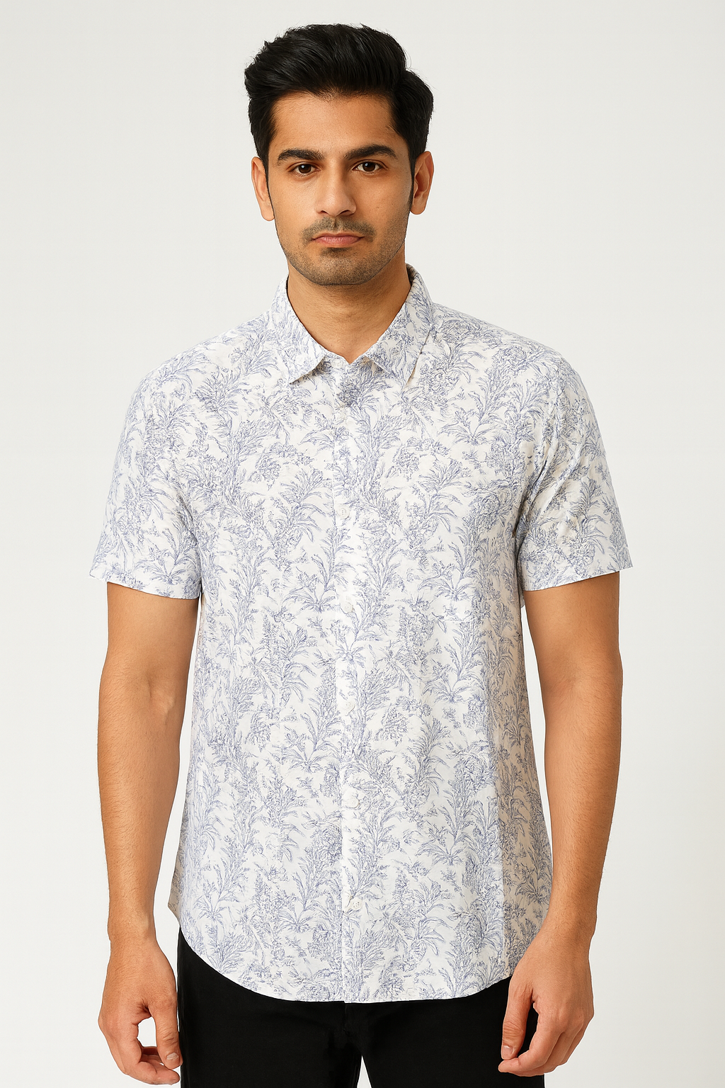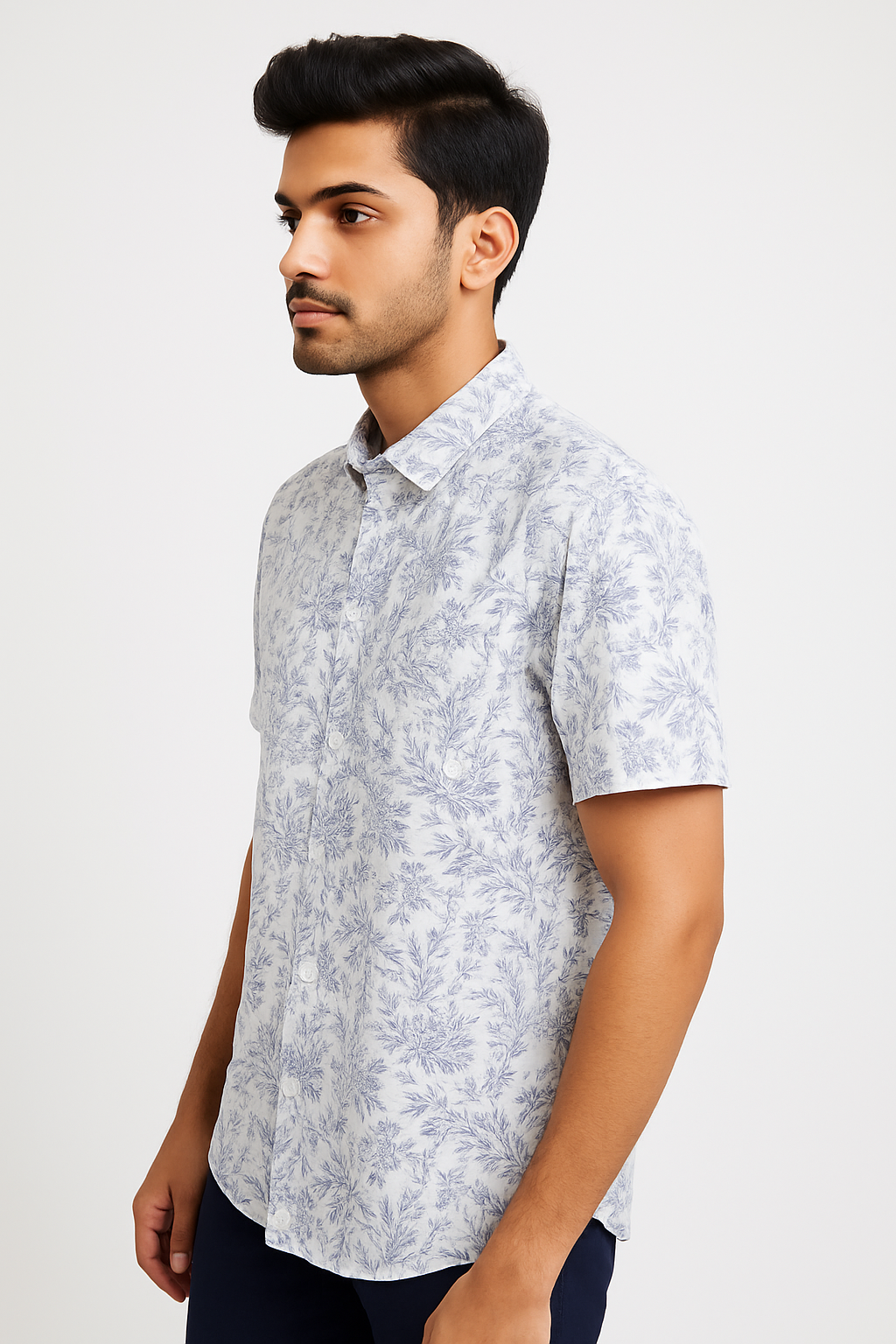 A lightweight white short-sleeve shirt featuring delicate blue floral prints, designed with a button-up closure and chest pocket for a refined casual look.