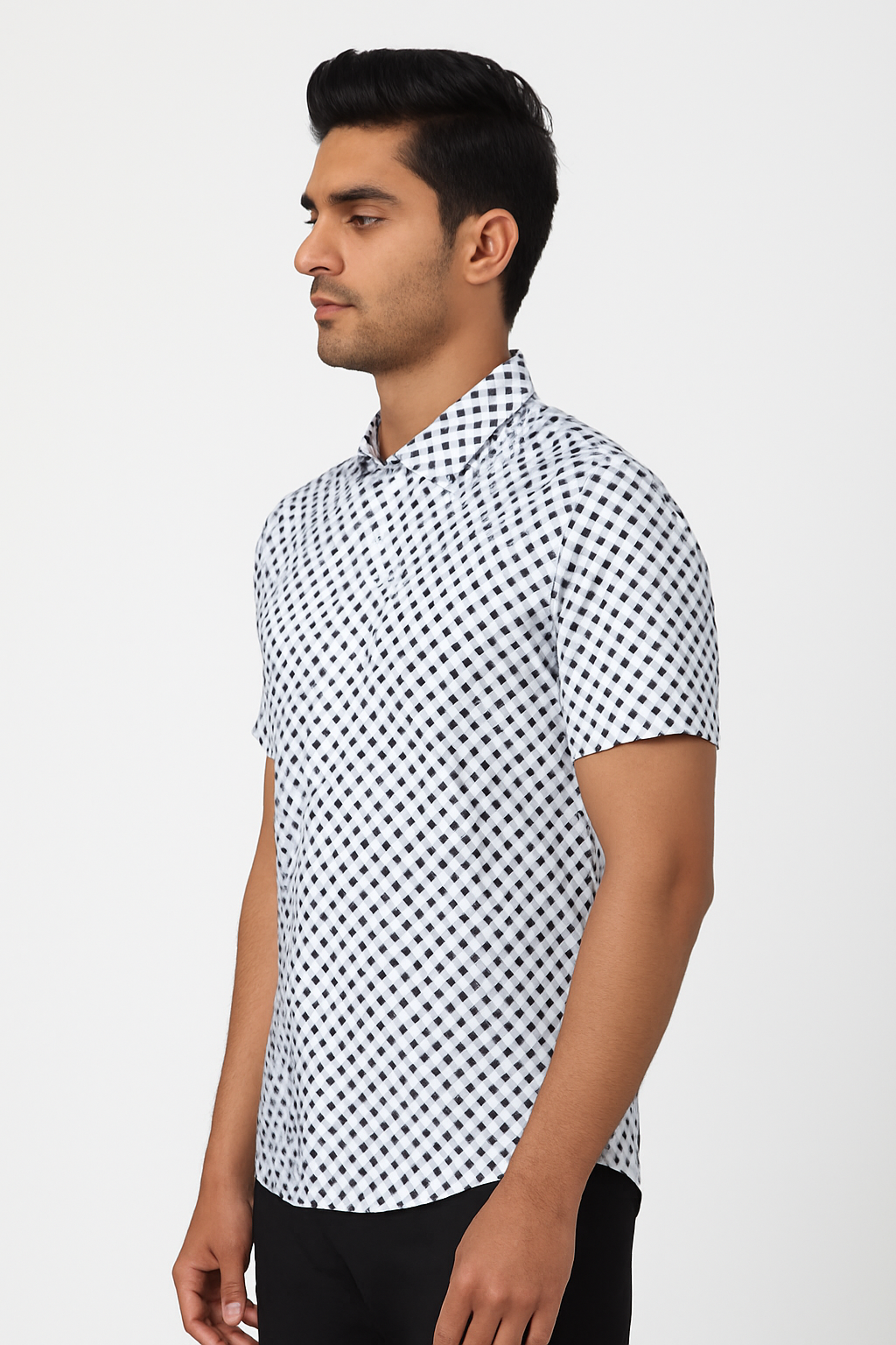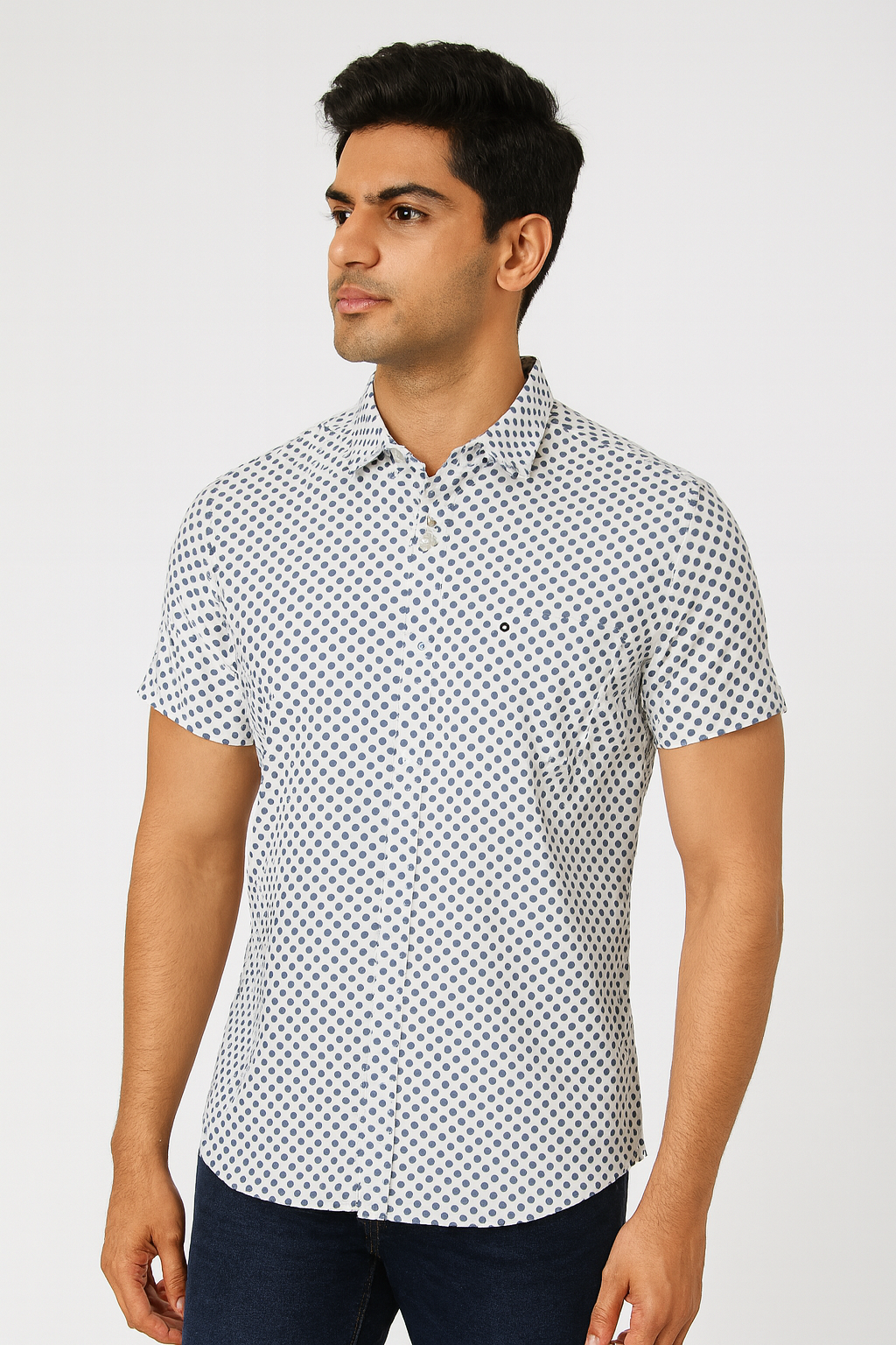 A crisp white shirt with stylish blue polka dots — crafted from breathable cotton for a smart and playful casual look.