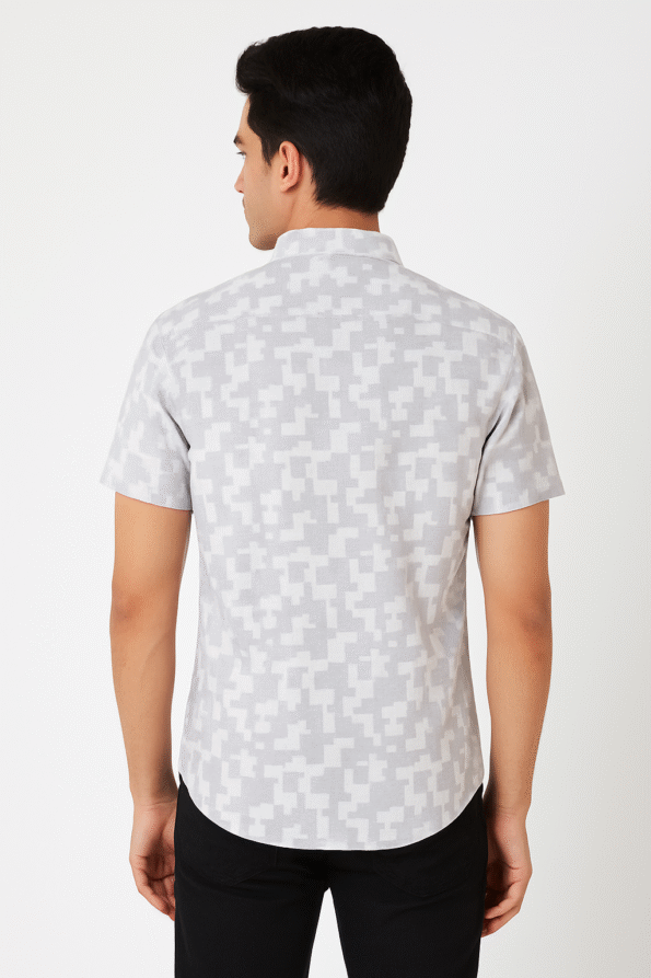 Give your everyday look a modern edge with this white geometric print shirt. The subtle block pattern adds a refined yet trendy touch, perfect for both casual Fridays and weekend outings. Crafted from breathable cotton blend fabric, this shirt offers a soft feel and all-day comfort. The clean lines, spread collar, and curved hem make it easy to style with chinos or jeans.