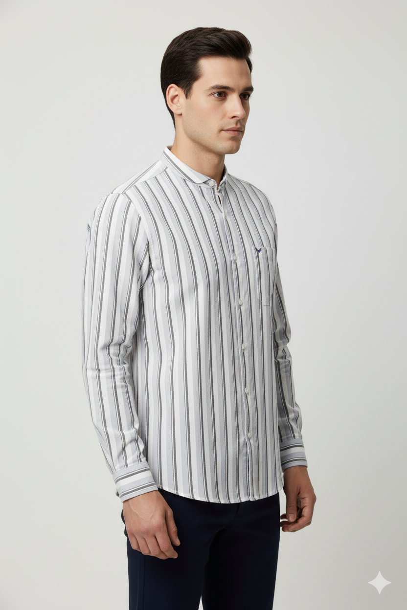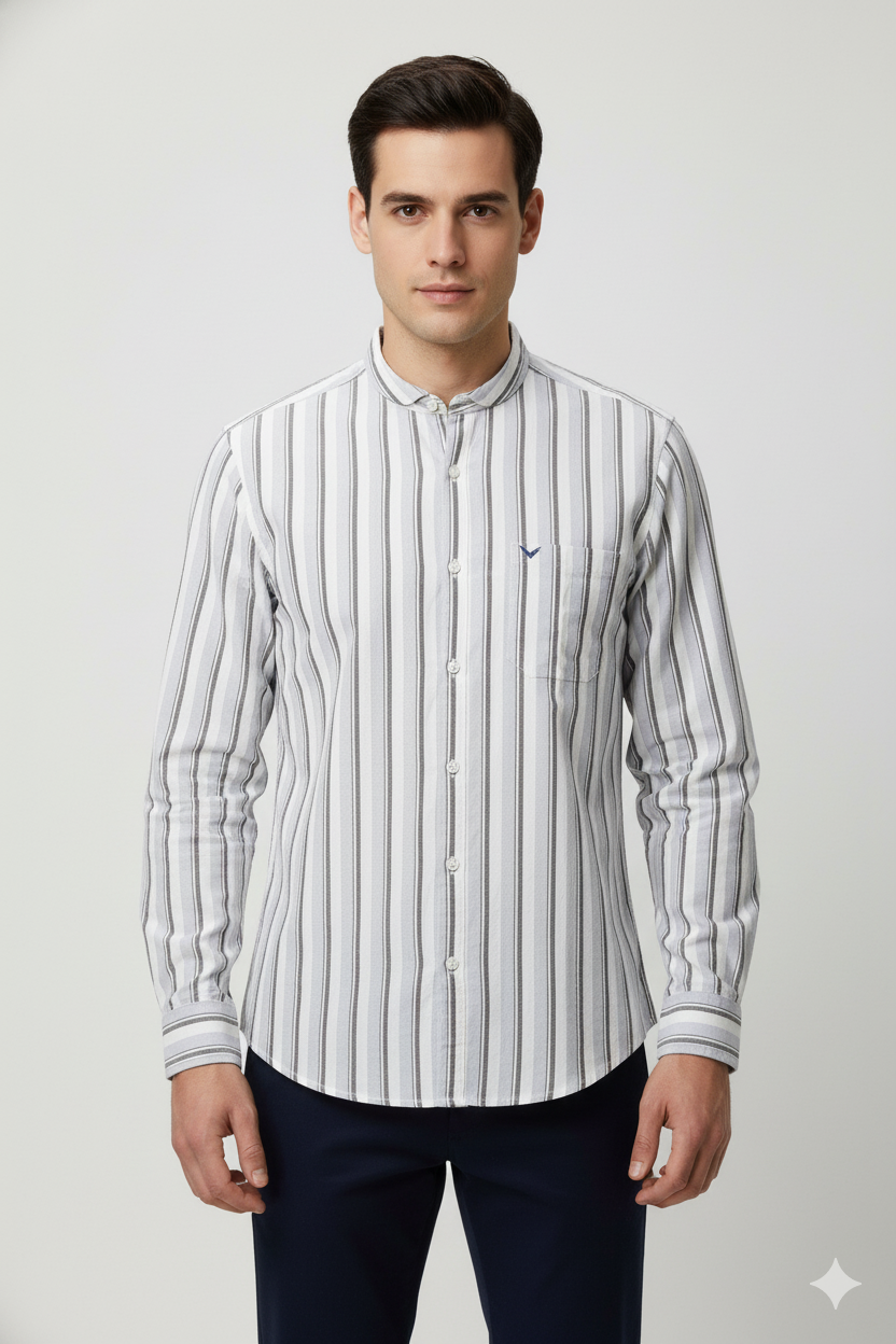 A stylish white and grey striped mandarin collar shirt made from soft, breathable cotton. Designed with full sleeves, button-down closure, and a chest pocket featuring a subtle embroidered logo — ideal for both formal and casual occasions.