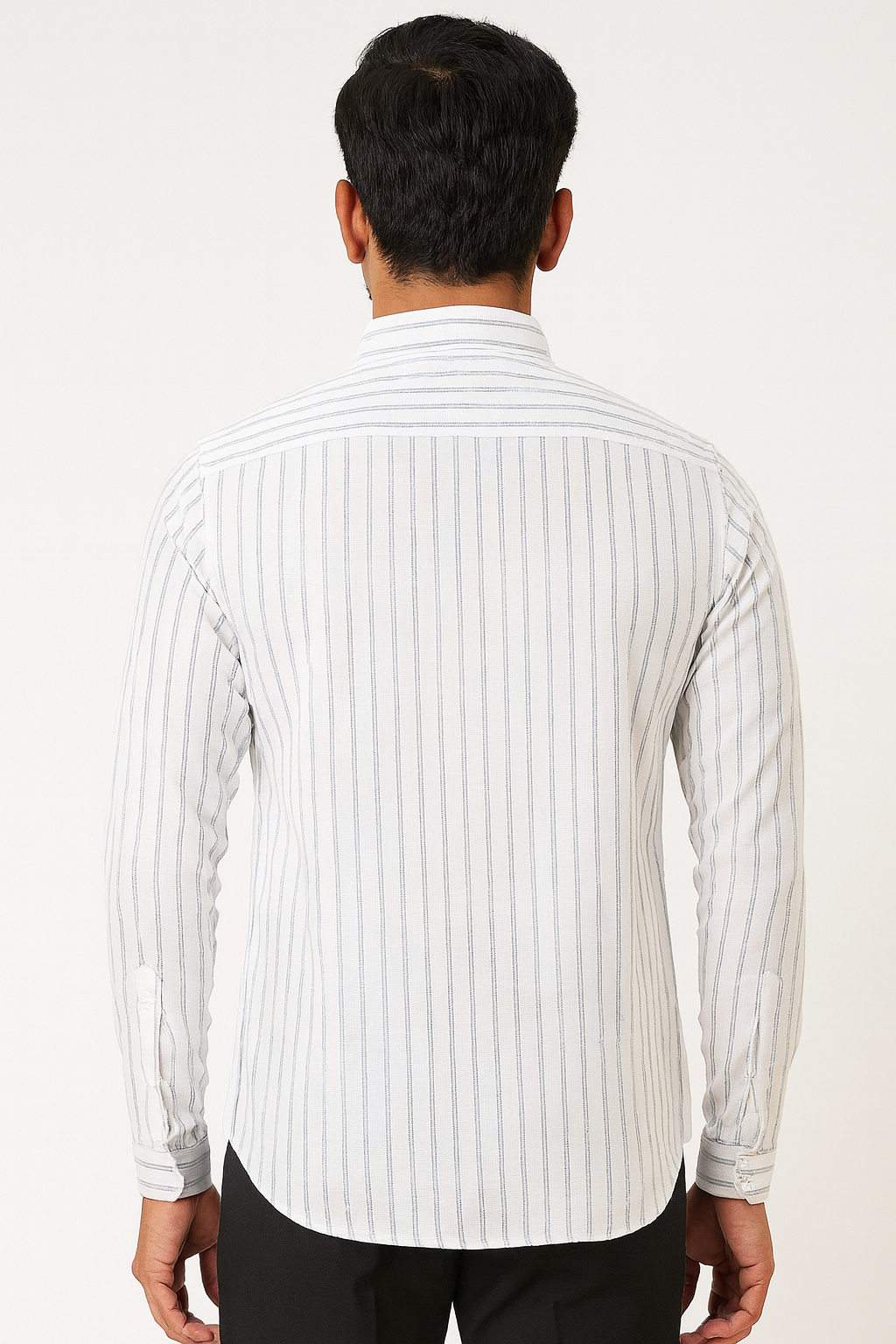 A crisp sky blue long-sleeve shirt with vertical white and beige stripes, a sleek mandarin collar, and full button placket—ideal for polished smart-casual style.