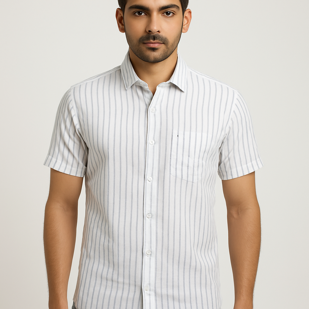 Stay cool and stylish with this men’s white and grey striped short sleeve shirt — a perfect blend of comfort and sophistication. Designed with a spread collar, full button-down front, and a smart chest pocket, this shirt offers a timeless appeal suitable for both casual and semi-formal occasions. The vertical stripes create a sleek, flattering look, while the breathable cotton-blend fabric ensures maximum comfort in warm weather. Pair it effortlessly with chinos or jeans for a polished yet relaxed outfit.