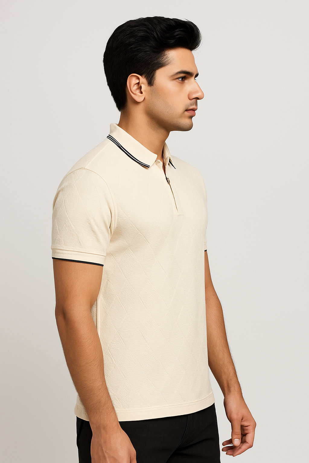 A refined cream polo featuring an elegant diamond-textured knit and contrast tipping on the collar and cuffs. The soft, breathable fabric and regular fit ensure all‑day comfort, while the neat two‑button placket keeps the look polished for smart‑casual outings.