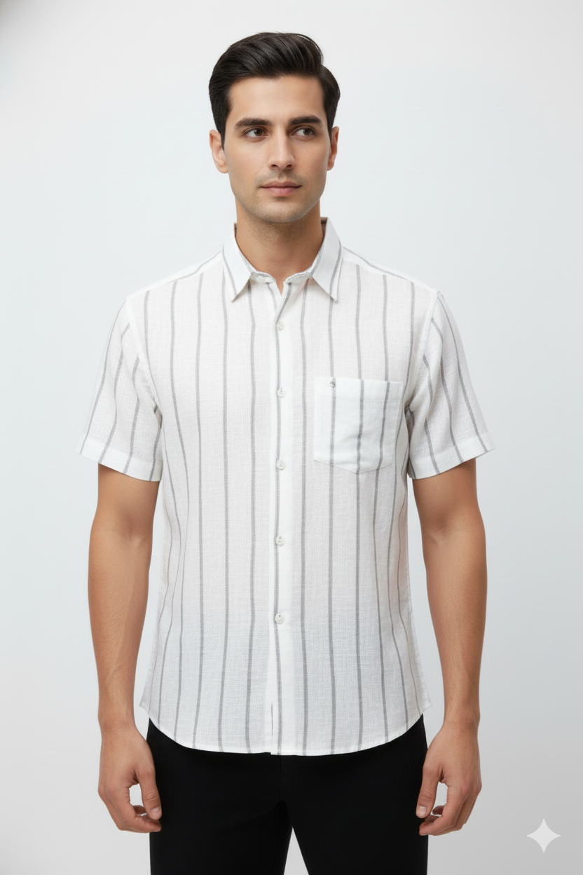 This men’s short-sleeve casual shirt features a timeless white base enhanced by evenly spaced grey vertical stripes, delivering a smart and sophisticated aesthetic. Crafted from soft, breathable fabric, it ensures superior comfort and ease of movement throughout the day. The shirt includes a button-down front, a neatly tailored collar, and a chest pocket for a touch of practicality. Perfect for both office-casual settings and weekend outings, it pairs effortlessly with chinos, jeans, or shorts for a clean, modern look.