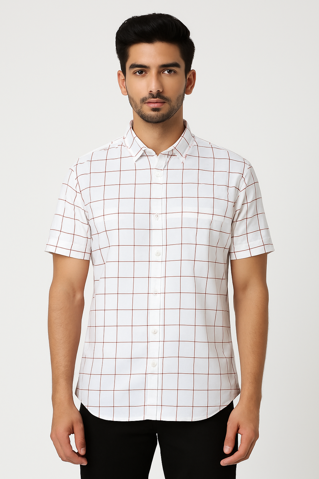 A crisp white short sleeve shirt with maroon checks — perfect for versatile casual and semi-formal wear.