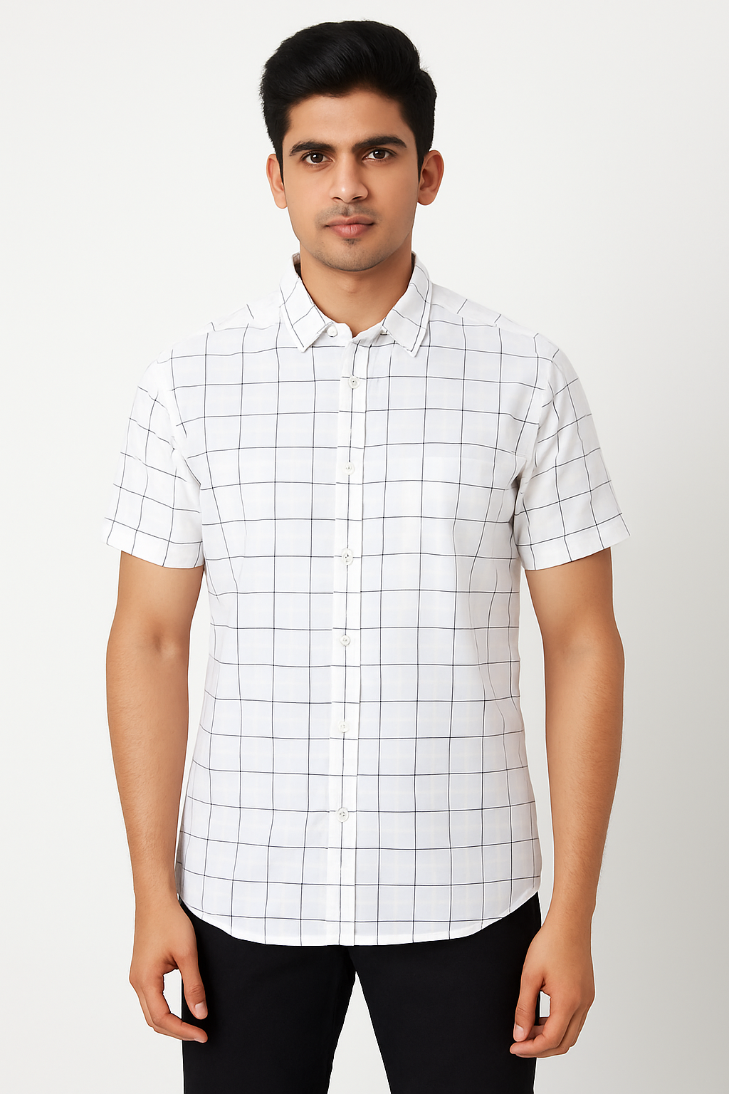 Upgrade your wardrobe with this men’s white short sleeve checkered shirt, designed for comfort and style. Crafted from soft and breathable fabric, this shirt features a clean white base with subtle black windowpane checks, offering a modern and polished aesthetic. The short sleeves make it ideal for warm weather, while the classic button-down design and chest pocket add functional detail. Pair it with chinos or jeans for a smart-casual ensemble that transitions seamlessly from day to night.