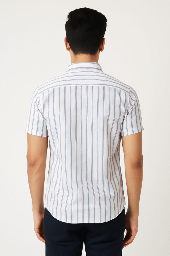 Step up your smart-casual style with this crisp white shirt featuring classic navy vertical stripes. Crafted from soft, breathable cotton fabric, this shirt ensures comfort while keeping you looking sharp all day long. The vertical stripe pattern adds a slimming effect and a touch of sophistication, making it ideal for office wear, casual outings, or weekend gatherings.