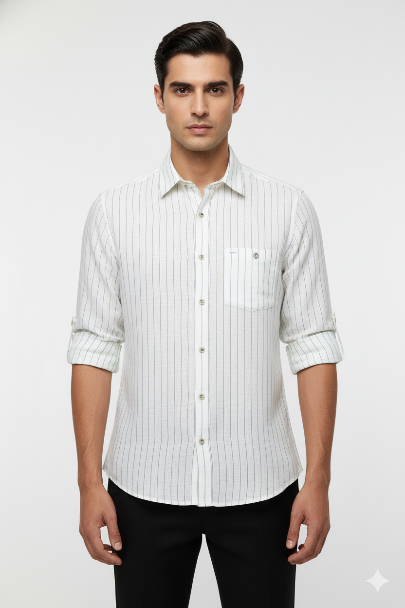 A modern take on the timeless striped shirt, this white slim-fit design is crafted from premium cotton for all-day comfort. It features subtle vertical stripes, a button-down front, and a functional chest pocket. The roll-up sleeves with button tabs make it easy to switch from formal to casual wear effortlessly. Perfect for office meetings, dinner dates, or weekend outings.