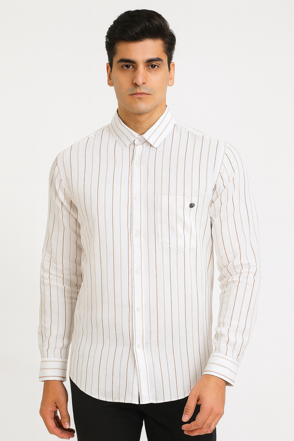 White cotton shirt with vertical brown stripes — stylish, breathable, and ideal for work or casual outings.