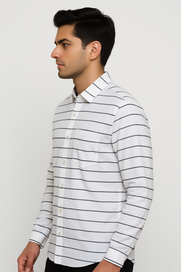 A stylish white shirt with fine black horizontal stripes, designed for a crisp and modern look. Featuring a button-down front, chest pocket, and full sleeves, this shirt blends comfort with sophistication. Perfect for both formal wear and casual outings, making it a versatile addition to any wardrobe.