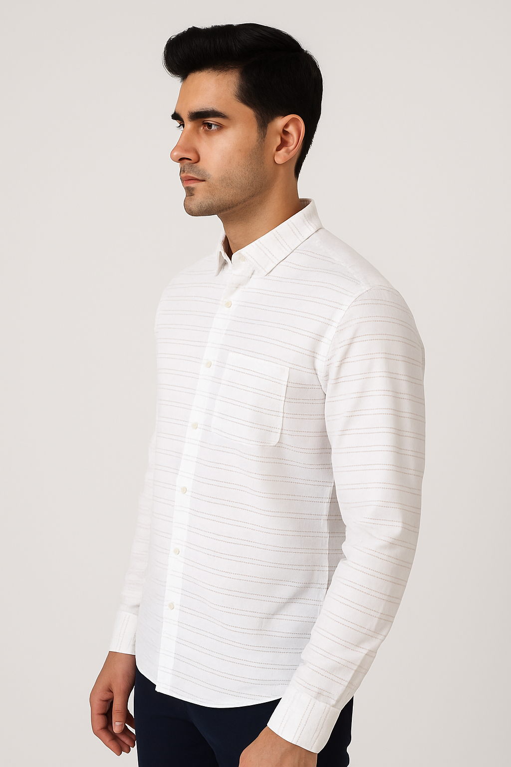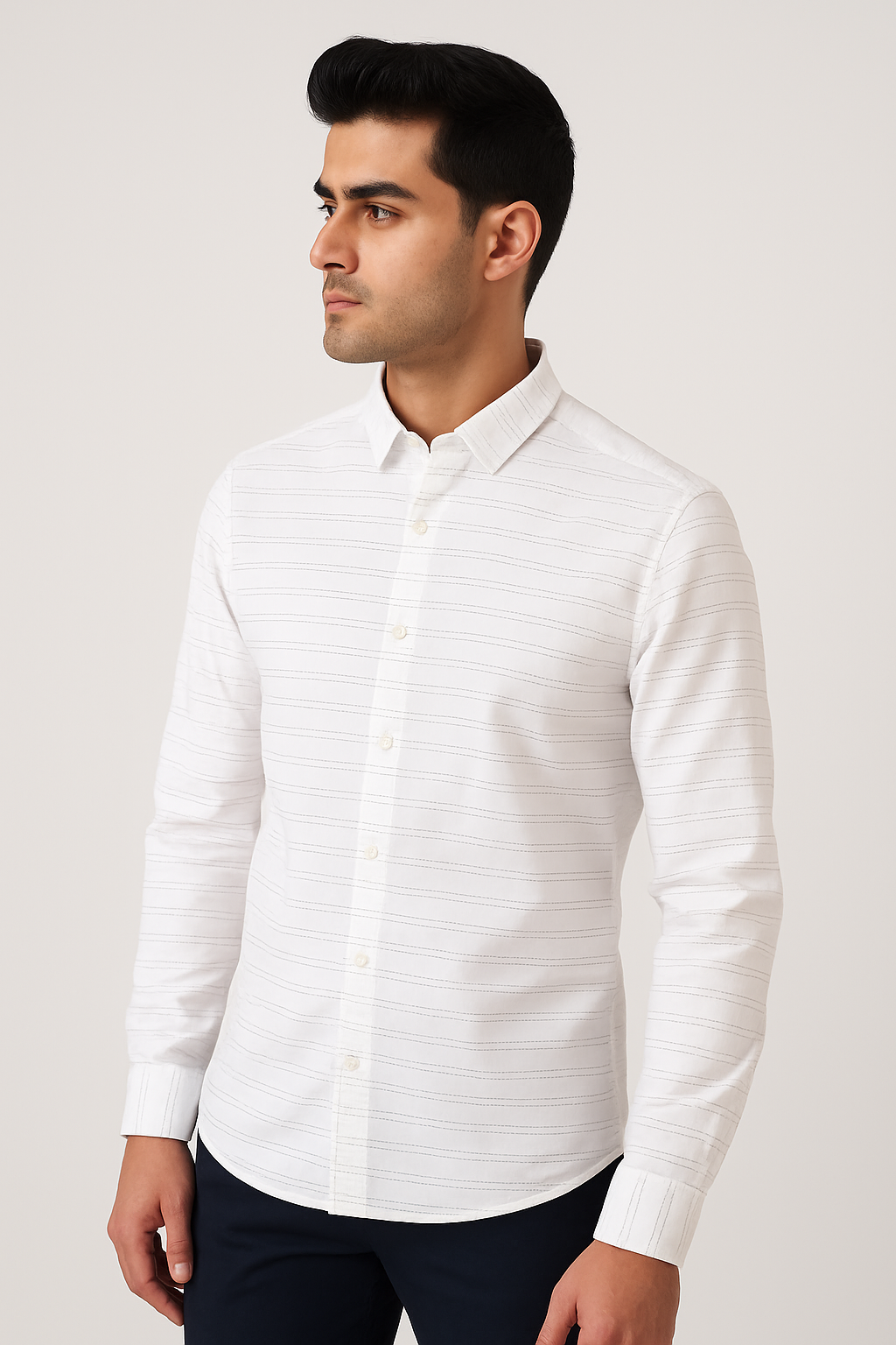 Refined and modern, this white textured slim-fit shirt is designed for the man who values understated elegance. Made from premium cotton fabric, it features subtle horizontal weave detailing that adds character without compromising on sophistication. Perfect for office wear, business meetings, or formal events — pair it with tailored trousers for a sharp, polished look.