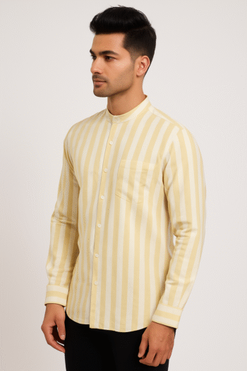 A crisp long-sleeve shirt with soft yellow and ivory vertical stripes, a modern mandarin collar, full button placket, and chest pocket—perfect for polished smart-casual looks.