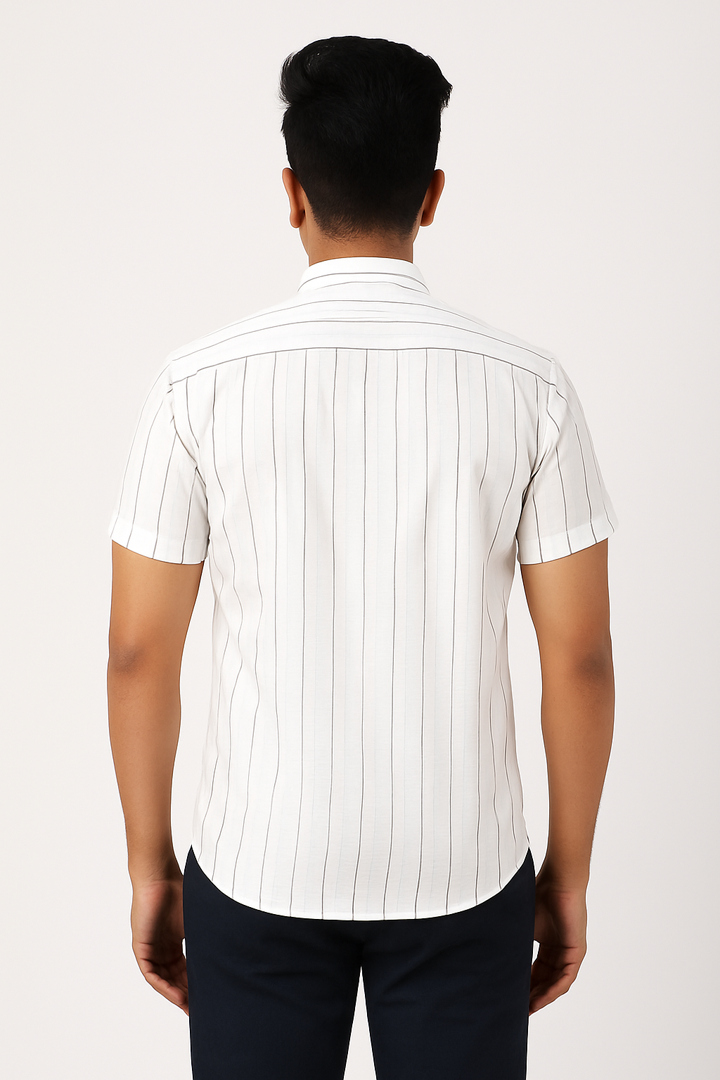 A timeless white striped shirt that combines smart appeal with casual ease — a wardrobe essential for every man.