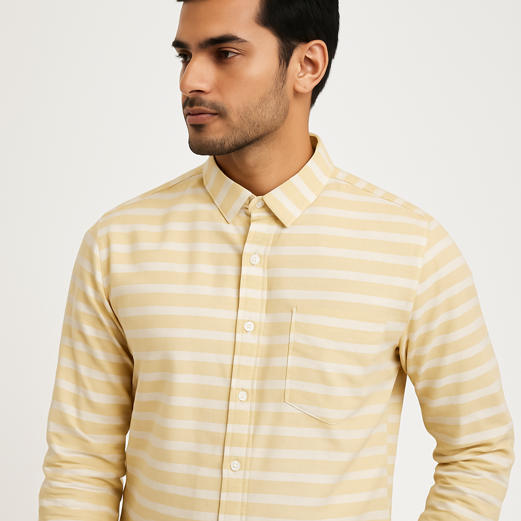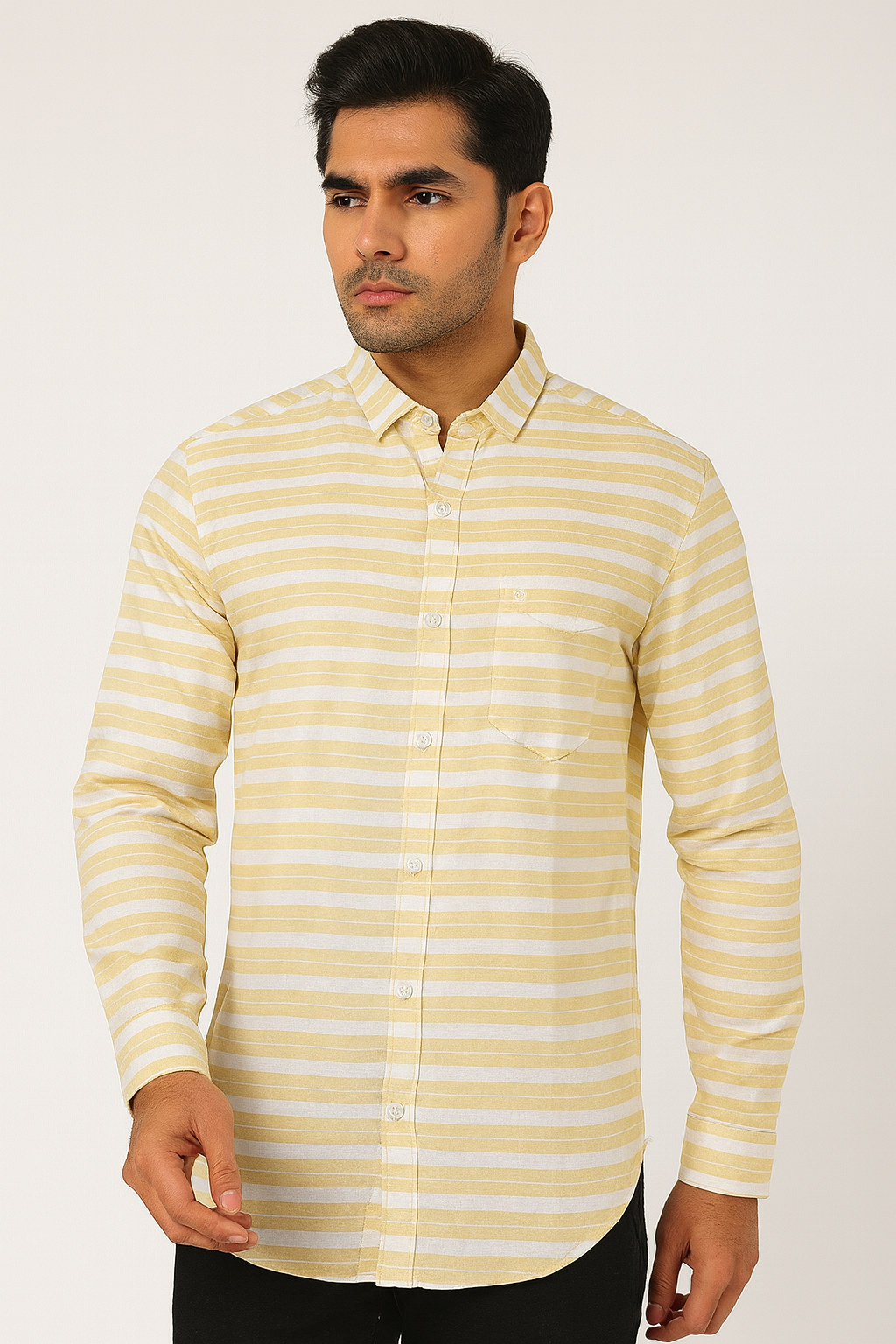 Yellow and white striped slim fit casual shirt with button-down design—ideal for casual and weekend wear.