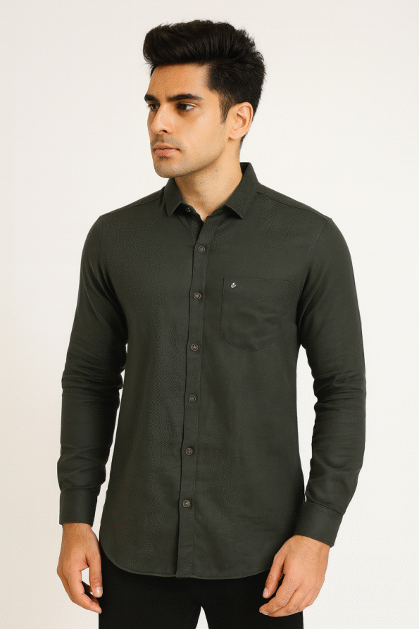 Plain olive green full-sleeve casual shirt with chest pocket and button-front—Cool Dude FS385 for effortless smart-casual style.