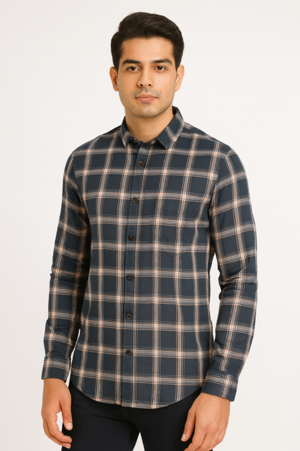 This casual shirt features a refined teal base with beige and charcoal checks that add structure while staying easy to style with denim or chinos. The classic collar and tailored sleeves keep the look polished for office-casual days and weekend plans, finished with smooth contrast buttons and a neat chest pocket. Crafted from breathable, comfortable fabric, it maintains a crisp appearance from day to night.