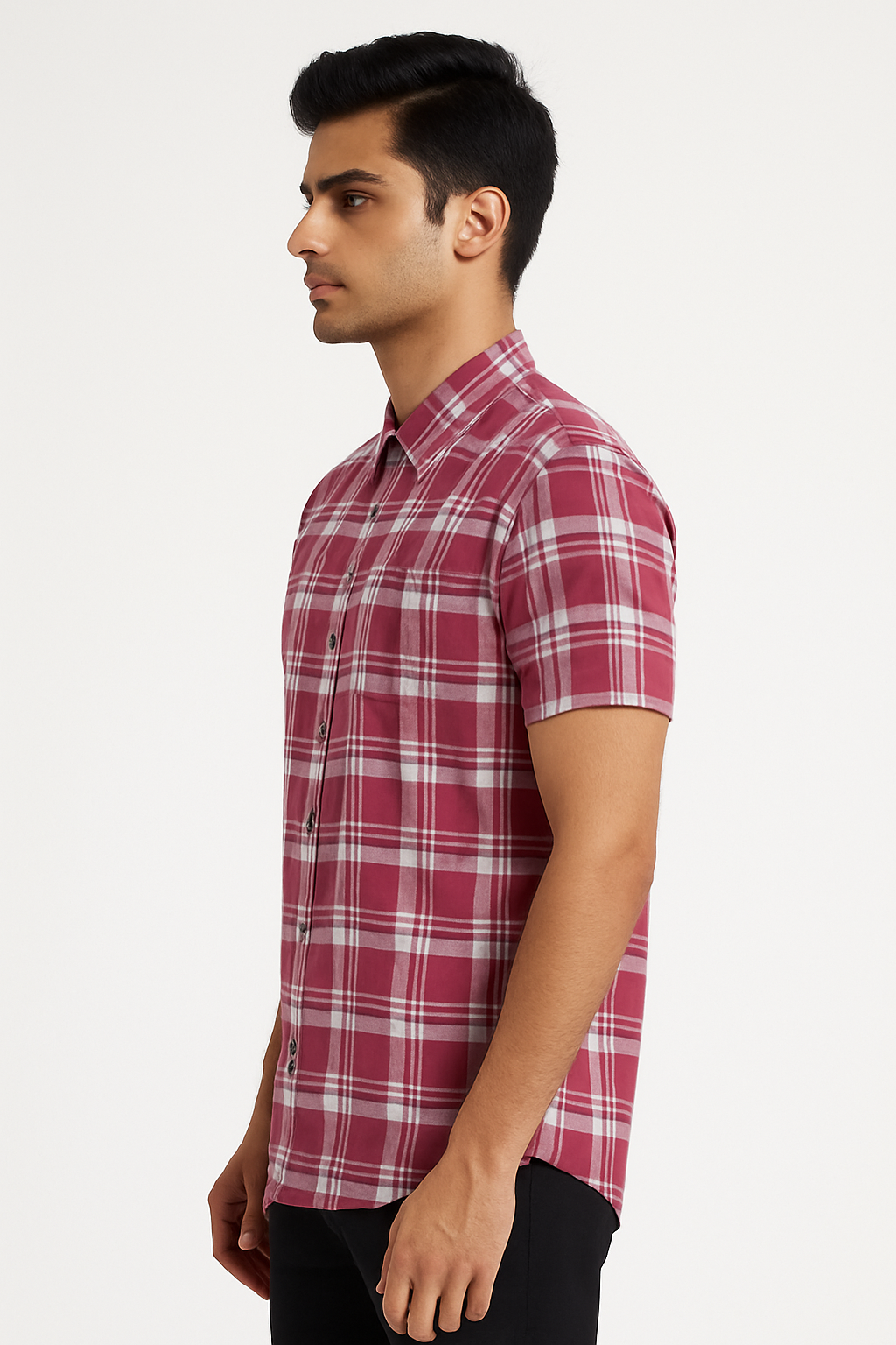 A timeless maroon and white checked shirt made from breathable cotton — perfect for casual and smart-casual looks.