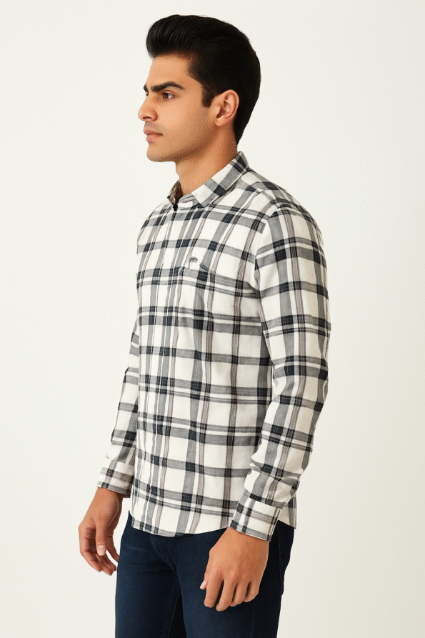 This casual shirt pairs a clean white base with structured grey checks for a versatile look that styles effortlessly with black denim or chinos. The classic collar and tailored sleeves keep the silhouette polished for office-casual days and weekend outings, finished with smooth buttons and a neat chest pocket. Crafted from breathable, comfortable fabric, it maintains a sharp appearance through day-to-night plans.