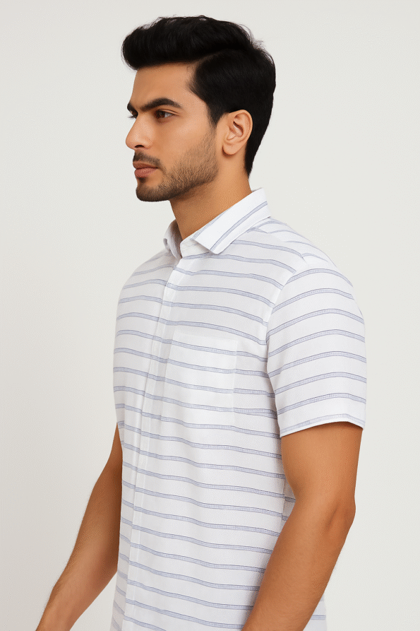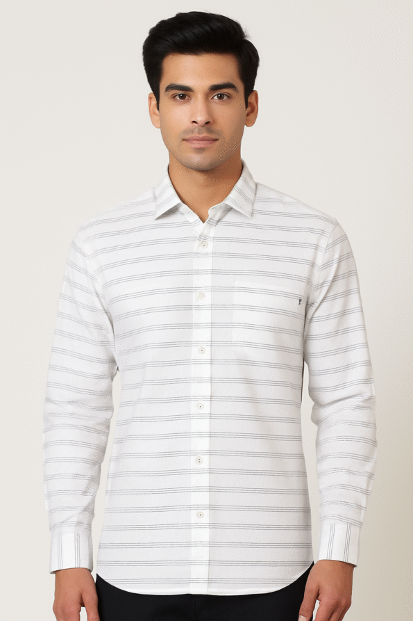 White full-sleeve shirt with fine horizontal stripes — soft, breathable, and ideal for formal or smart-casual wear.