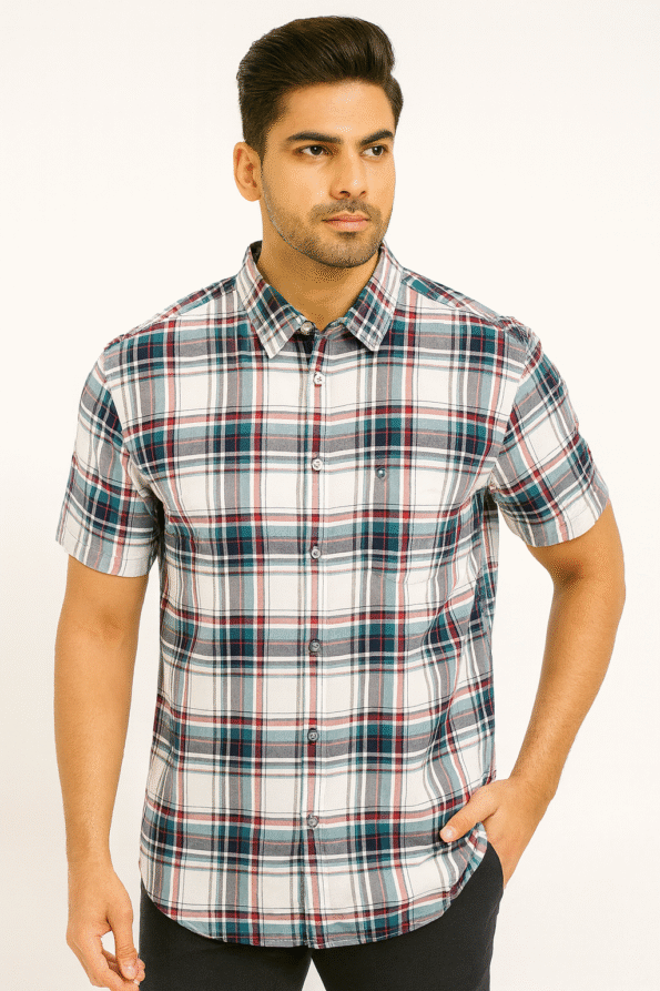 Upgrade your wardrobe with this white, red, and teal checked short sleeve shirt. Featuring a button-down design, chest pocket, and a structured collar, this shirt brings a perfect balance of casual comfort and smart style. The multi-color check pattern adds vibrance while keeping the look versatile for both workdays and weekends. Crafted from soft and breathable fabric, it ensures ease of movement and day-long comfort. Pair it with chinos, jeans, or shorts for an effortlessly stylish outfit.