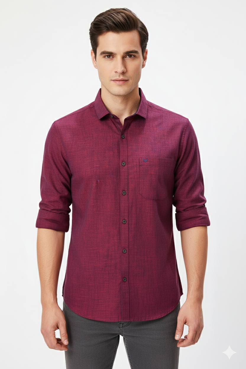 Elevate your everyday style with this premium wine red textured casual shirt for men. Crafted from 100% breathable cotton, it ensures superior comfort and durability throughout the day. The shirt features a fine textured weave, full sleeves with roll-up cuffs, and a button-down front that exudes understated elegance. A front chest pocket with subtle embroidered detailing adds a refined touch. Ideal for office wear, parties, or evening outings, this shirt pairs effortlessly with jeans or chinos to create a modern, confident look.
