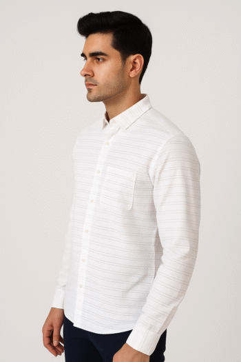 ₹599.00Original price was: ₹599.00.₹499.00Current price is: ₹499.00.Select optionsWhite full-sleeve shirt with fine horizontal stripes — soft, breathable, and ideal for formal or smart-casual wear.